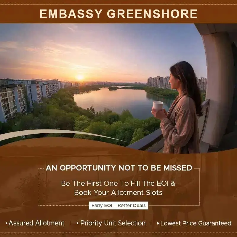 The development presents a choice of 2, 3, and 4 BHK apartments ranging from 1,200 sq.ft. to 2,600 sq.ft., distributed across 8 elegant towers rising 18 floors each. Every residence is thoughtfully designed with spacious layouts, premium finishes, modular kitchens, designer bathrooms, and superior flooring—ensuring both style and comfort. With abundant natural light, excellent ventilation, and scenic views of landscaped gardens and township greens, Embassy Greenshore promises an elevated living experience within a vibrant community.